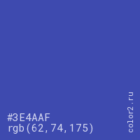 Цвет #3E4AAF в цветовой модели RGB обозначается тремя октетами (62, 74, 175) в десятичном формате и #3E4AAF в шестнадцатиричном (hex) формате, которые являются интенсивностью красного 62 (hex 3E), интенсивность зелёного 74 (hex 4A) и интенсивность синего 175 (hex AF).