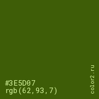 Цвет #3E5D07 в цветовой модели RGB обозначается тремя октетами (62, 93, 7) в десятичном формате и #3E5D07 в шестнадцатиричном (hex) формате, которые являются интенсивностью красного 62 (hex 3E), интенсивность зелёного 93 (hex 5D) и интенсивность синего 7 (hex 07).