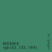 Цвет #3E8568 в цветовой модели RGB обозначается тремя октетами (62, 133, 104) в десятичном формате и #3E8568 в шестнадцатиричном (hex) формате, которые являются интенсивностью красного 62 (hex 3E), интенсивность зелёного 133 (hex 85) и интенсивность синего 104 (hex 68).