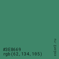 Цвет #3E8669 в цветовой модели RGB обозначается тремя октетами (62, 134, 105) в десятичном формате и #3E8669 в шестнадцатиричном (hex) формате, которые являются интенсивностью красного 62 (hex 3E), интенсивность зелёного 134 (hex 86) и интенсивность синего 105 (hex 69).