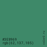Цвет #3E8969 в цветовой модели RGB обозначается тремя октетами (62, 137, 105) в десятичном формате и #3E8969 в шестнадцатиричном (hex) формате, которые являются интенсивностью красного 62 (hex 3E), интенсивность зелёного 137 (hex 89) и интенсивность синего 105 (hex 69).