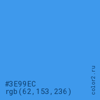 Цвет #3E99EC в цветовой модели RGB обозначается тремя октетами (62, 153, 236) в десятичном формате и #3E99EC в шестнадцатиричном (hex) формате, которые являются интенсивностью красного 62 (hex 3E), интенсивность зелёного 153 (hex 99) и интенсивность синего 236 (hex EC).