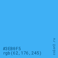Цвет #3EB0F5 в цветовой модели RGB обозначается тремя октетами (62, 176, 245) в десятичном формате и #3EB0F5 в шестнадцатиричном (hex) формате, которые являются интенсивностью красного 62 (hex 3E), интенсивность зелёного 176 (hex B0) и интенсивность синего 245 (hex F5).