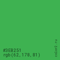 Цвет #3EB251 в цветовой модели RGB обозначается тремя октетами (62, 178, 81) в десятичном формате и #3EB251 в шестнадцатиричном (hex) формате, которые являются интенсивностью красного 62 (hex 3E), интенсивность зелёного 178 (hex B2) и интенсивность синего 81 (hex 51).