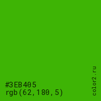 Цвет #3EB405 в цветовой модели RGB обозначается тремя октетами (62, 180, 5) в десятичном формате и #3EB405 в шестнадцатиричном (hex) формате, которые являются интенсивностью красного 62 (hex 3E), интенсивность зелёного 180 (hex B4) и интенсивность синего 5 (hex 05).