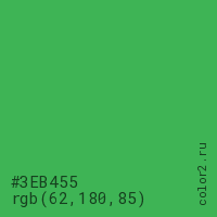 Цвет #3EB455 в цветовой модели RGB обозначается тремя октетами (62, 180, 85) в десятичном формате и #3EB455 в шестнадцатиричном (hex) формате, которые являются интенсивностью красного 62 (hex 3E), интенсивность зелёного 180 (hex B4) и интенсивность синего 85 (hex 55).