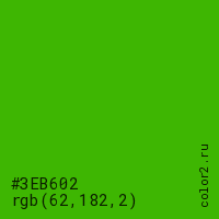 Цвет #3EB602 в цветовой модели RGB обозначается тремя октетами (62, 182, 2) в десятичном формате и #3EB602 в шестнадцатиричном (hex) формате, которые являются интенсивностью красного 62 (hex 3E), интенсивность зелёного 182 (hex B6) и интенсивность синего 2 (hex 02).