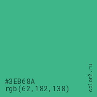 Цвет #3EB68A в цветовой модели RGB обозначается тремя октетами (62, 182, 138) в десятичном формате и #3EB68A в шестнадцатиричном (hex) формате, которые являются интенсивностью красного 62 (hex 3E), интенсивность зелёного 182 (hex B6) и интенсивность синего 138 (hex 8A).