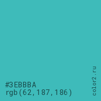 Цвет #3EBBBA в цветовой модели RGB обозначается тремя октетами (62, 187, 186) в десятичном формате и #3EBBBA в шестнадцатиричном (hex) формате, которые являются интенсивностью красного 62 (hex 3E), интенсивность зелёного 187 (hex BB) и интенсивность синего 186 (hex BA).