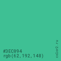 Цвет #3EC094 в цветовой модели RGB обозначается тремя октетами (62, 192, 148) в десятичном формате и #3EC094 в шестнадцатиричном (hex) формате, которые являются интенсивностью красного 62 (hex 3E), интенсивность зелёного 192 (hex C0) и интенсивность синего 148 (hex 94).