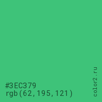 Цвет #3EC379 в цветовой модели RGB обозначается тремя октетами (62, 195, 121) в десятичном формате и #3EC379 в шестнадцатиричном (hex) формате, которые являются интенсивностью красного 62 (hex 3E), интенсивность зелёного 195 (hex C3) и интенсивность синего 121 (hex 79).