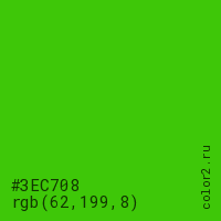 Цвет #3EC708 в цветовой модели RGB обозначается тремя октетами (62, 199, 8) в десятичном формате и #3EC708 в шестнадцатиричном (hex) формате, которые являются интенсивностью красного 62 (hex 3E), интенсивность зелёного 199 (hex C7) и интенсивность синего 8 (hex 08).