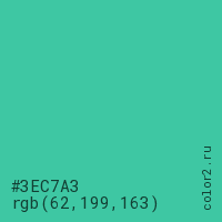Цвет #3EC7A3 в цветовой модели RGB обозначается тремя октетами (62, 199, 163) в десятичном формате и #3EC7A3 в шестнадцатиричном (hex) формате, которые являются интенсивностью красного 62 (hex 3E), интенсивность зелёного 199 (hex C7) и интенсивность синего 163 (hex A3).