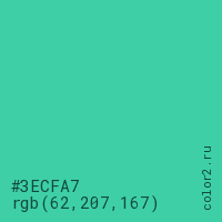 Цвет #3ECFA7 в цветовой модели RGB обозначается тремя октетами (62, 207, 167) в десятичном формате и #3ECFA7 в шестнадцатиричном (hex) формате, которые являются интенсивностью красного 62 (hex 3E), интенсивность зелёного 207 (hex CF) и интенсивность синего 167 (hex A7).