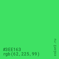 Цвет #3EE163 в цветовой модели RGB обозначается тремя октетами (62, 225, 99) в десятичном формате и #3EE163 в шестнадцатиричном (hex) формате, которые являются интенсивностью красного 62 (hex 3E), интенсивность зелёного 225 (hex E1) и интенсивность синего 99 (hex 63).