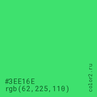 Цвет #3EE16E в цветовой модели RGB обозначается тремя октетами (62, 225, 110) в десятичном формате и #3EE16E в шестнадцатиричном (hex) формате, которые являются интенсивностью красного 62 (hex 3E), интенсивность зелёного 225 (hex E1) и интенсивность синего 110 (hex 6E).