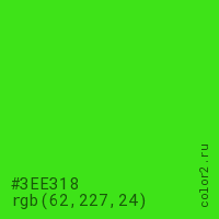 Цвет #3EE318 в цветовой модели RGB обозначается тремя октетами (62, 227, 24) в десятичном формате и #3EE318 в шестнадцатиричном (hex) формате, которые являются интенсивностью красного 62 (hex 3E), интенсивность зелёного 227 (hex E3) и интенсивность синего 24 (hex 18).