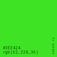 Цвет #3EE424 в цветовой модели RGB обозначается тремя октетами (62, 228, 36) в десятичном формате и #3EE424 в шестнадцатиричном (hex) формате, которые являются интенсивностью красного 62 (hex 3E), интенсивность зелёного 228 (hex E4) и интенсивность синего 36 (hex 24).