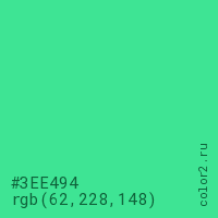 Цвет #3EE494 в цветовой модели RGB обозначается тремя октетами (62, 228, 148) в десятичном формате и #3EE494 в шестнадцатиричном (hex) формате, которые являются интенсивностью красного 62 (hex 3E), интенсивность зелёного 228 (hex E4) и интенсивность синего 148 (hex 94).