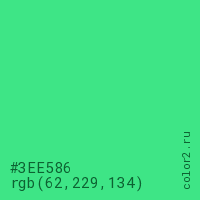 Цвет #3EE586 в цветовой модели RGB обозначается тремя октетами (62, 229, 134) в десятичном формате и #3EE586 в шестнадцатиричном (hex) формате, которые являются интенсивностью красного 62 (hex 3E), интенсивность зелёного 229 (hex E5) и интенсивность синего 134 (hex 86).