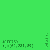 Цвет #3EE759 в цветовой модели RGB обозначается тремя октетами (62, 231, 89) в десятичном формате и #3EE759 в шестнадцатиричном (hex) формате, которые являются интенсивностью красного 62 (hex 3E), интенсивность зелёного 231 (hex E7) и интенсивность синего 89 (hex 59).