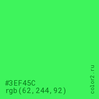 Цвет #3EF45C в цветовой модели RGB обозначается тремя октетами (62, 244, 92) в десятичном формате и #3EF45C в шестнадцатиричном (hex) формате, которые являются интенсивностью красного 62 (hex 3E), интенсивность зелёного 244 (hex F4) и интенсивность синего 92 (hex 5C).