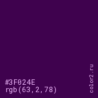 Цвет #3F024E в цветовой модели RGB обозначается тремя октетами (63, 2, 78) в десятичном формате и #3F024E в шестнадцатиричном (hex) формате, которые являются интенсивностью красного 63 (hex 3F), интенсивность зелёного 2 (hex 02) и интенсивность синего 78 (hex 4E).
