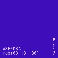 Цвет #3F0DBA в цветовой модели RGB обозначается тремя октетами (63, 13, 186) в десятичном формате и #3F0DBA в шестнадцатиричном (hex) формате, которые являются интенсивностью красного 63 (hex 3F), интенсивность зелёного 13 (hex 0D) и интенсивность синего 186 (hex BA).