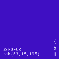 Цвет #3F0FC3 в цветовой модели RGB обозначается тремя октетами (63, 15, 195) в десятичном формате и #3F0FC3 в шестнадцатиричном (hex) формате, которые являются интенсивностью красного 63 (hex 3F), интенсивность зелёного 15 (hex 0F) и интенсивность синего 195 (hex C3).