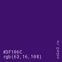 Цвет #3F106C в цветовой модели RGB обозначается тремя октетами (63, 16, 108) в десятичном формате и #3F106C в шестнадцатиричном (hex) формате, которые являются интенсивностью красного 63 (hex 3F), интенсивность зелёного 16 (hex 10) и интенсивность синего 108 (hex 6C).