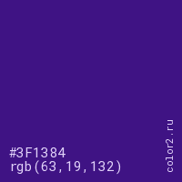 Цвет #3F1384 в цветовой модели RGB обозначается тремя октетами (63, 19, 132) в десятичном формате и #3F1384 в шестнадцатиричном (hex) формате, которые являются интенсивностью красного 63 (hex 3F), интенсивность зелёного 19 (hex 13) и интенсивность синего 132 (hex 84).