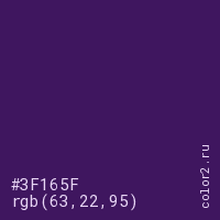 Цвет #3F165F в цветовой модели RGB обозначается тремя октетами (63, 22, 95) в десятичном формате и #3F165F в шестнадцатиричном (hex) формате, которые являются интенсивностью красного 63 (hex 3F), интенсивность зелёного 22 (hex 16) и интенсивность синего 95 (hex 5F).