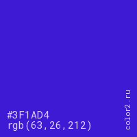 Цвет #3F1AD4 в цветовой модели RGB обозначается тремя октетами (63, 26, 212) в десятичном формате и #3F1AD4 в шестнадцатиричном (hex) формате, которые являются интенсивностью красного 63 (hex 3F), интенсивность зелёного 26 (hex 1A) и интенсивность синего 212 (hex D4).