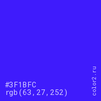 Цвет #3F1BFC в цветовой модели RGB обозначается тремя октетами (63, 27, 252) в десятичном формате и #3F1BFC в шестнадцатиричном (hex) формате, которые являются интенсивностью красного 63 (hex 3F), интенсивность зелёного 27 (hex 1B) и интенсивность синего 252 (hex FC).