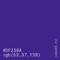 Цвет #3F258A в цветовой модели RGB обозначается тремя октетами (63, 37, 138) в десятичном формате и #3F258A в шестнадцатиричном (hex) формате, которые являются интенсивностью красного 63 (hex 3F), интенсивность зелёного 37 (hex 25) и интенсивность синего 138 (hex 8A).