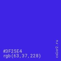 Цвет #3F25E4 в цветовой модели RGB обозначается тремя октетами (63, 37, 228) в десятичном формате и #3F25E4 в шестнадцатиричном (hex) формате, которые являются интенсивностью красного 63 (hex 3F), интенсивность зелёного 37 (hex 25) и интенсивность синего 228 (hex E4).