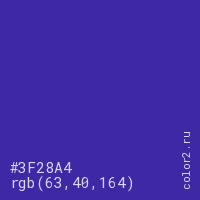 Цвет #3F28A4 в цветовой модели RGB обозначается тремя октетами (63, 40, 164) в десятичном формате и #3F28A4 в шестнадцатиричном (hex) формате, которые являются интенсивностью красного 63 (hex 3F), интенсивность зелёного 40 (hex 28) и интенсивность синего 164 (hex A4).