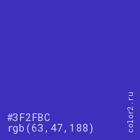 Цвет #3F2FBC в цветовой модели RGB обозначается тремя октетами (63, 47, 188) в десятичном формате и #3F2FBC в шестнадцатиричном (hex) формате, которые являются интенсивностью красного 63 (hex 3F), интенсивность зелёного 47 (hex 2F) и интенсивность синего 188 (hex BC).