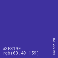 Цвет #3F319F в цветовой модели RGB обозначается тремя октетами (63, 49, 159) в десятичном формате и #3F319F в шестнадцатиричном (hex) формате, которые являются интенсивностью красного 63 (hex 3F), интенсивность зелёного 49 (hex 31) и интенсивность синего 159 (hex 9F).