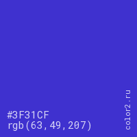 Цвет #3F31CF в цветовой модели RGB обозначается тремя октетами (63, 49, 207) в десятичном формате и #3F31CF в шестнадцатиричном (hex) формате, которые являются интенсивностью красного 63 (hex 3F), интенсивность зелёного 49 (hex 31) и интенсивность синего 207 (hex CF).