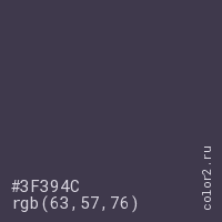 Цвет #3F394C в цветовой модели RGB обозначается тремя октетами (63, 57, 76) в десятичном формате и #3F394C в шестнадцатиричном (hex) формате, которые являются интенсивностью красного 63 (hex 3F), интенсивность зелёного 57 (hex 39) и интенсивность синего 76 (hex 4C).