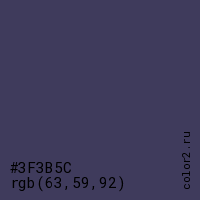 Цвет #3F3B5C в цветовой модели RGB обозначается тремя октетами (63, 59, 92) в десятичном формате и #3F3B5C в шестнадцатиричном (hex) формате, которые являются интенсивностью красного 63 (hex 3F), интенсивность зелёного 59 (hex 3B) и интенсивность синего 92 (hex 5C).