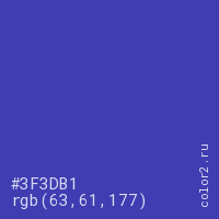 Цвет #3F3DB1 в цветовой модели RGB обозначается тремя октетами (63, 61, 177) в десятичном формате и #3F3DB1 в шестнадцатиричном (hex) формате, которые являются интенсивностью красного 63 (hex 3F), интенсивность зелёного 61 (hex 3D) и интенсивность синего 177 (hex B1).