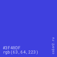 Цвет #3F40DF в цветовой модели RGB обозначается тремя октетами (63, 64, 223) в десятичном формате и #3F40DF в шестнадцатиричном (hex) формате, которые являются интенсивностью красного 63 (hex 3F), интенсивность зелёного 64 (hex 40) и интенсивность синего 223 (hex DF).