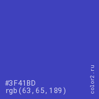 Цвет #3F41BD в цветовой модели RGB обозначается тремя октетами (63, 65, 189) в десятичном формате и #3F41BD в шестнадцатиричном (hex) формате, которые являются интенсивностью красного 63 (hex 3F), интенсивность зелёного 65 (hex 41) и интенсивность синего 189 (hex BD).