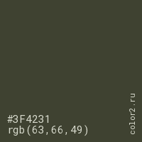 Цвет #3F4231 в цветовой модели RGB обозначается тремя октетами (63, 66, 49) в десятичном формате и #3F4231 в шестнадцатиричном (hex) формате, которые являются интенсивностью красного 63 (hex 3F), интенсивность зелёного 66 (hex 42) и интенсивность синего 49 (hex 31).