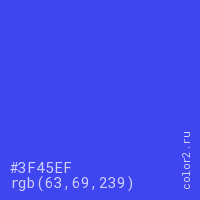 Цвет #3F45EF в цветовой модели RGB обозначается тремя октетами (63, 69, 239) в десятичном формате и #3F45EF в шестнадцатиричном (hex) формате, которые являются интенсивностью красного 63 (hex 3F), интенсивность зелёного 69 (hex 45) и интенсивность синего 239 (hex EF).