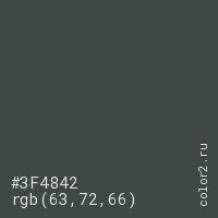 Цвет #3F4842 в цветовой модели RGB обозначается тремя октетами (63, 72, 66) в десятичном формате и #3F4842 в шестнадцатиричном (hex) формате, которые являются интенсивностью красного 63 (hex 3F), интенсивность зелёного 72 (hex 48) и интенсивность синего 66 (hex 42).