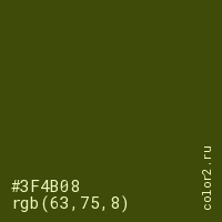 Цвет #3F4B08 в цветовой модели RGB обозначается тремя октетами (63, 75, 8) в десятичном формате и #3F4B08 в шестнадцатиричном (hex) формате, которые являются интенсивностью красного 63 (hex 3F), интенсивность зелёного 75 (hex 4B) и интенсивность синего 8 (hex 08).