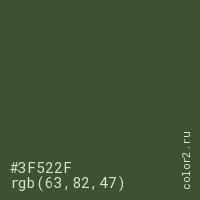 Цвет #3F522F в цветовой модели RGB обозначается тремя октетами (63, 82, 47) в десятичном формате и #3F522F в шестнадцатиричном (hex) формате, которые являются интенсивностью красного 63 (hex 3F), интенсивность зелёного 82 (hex 52) и интенсивность синего 47 (hex 2F).